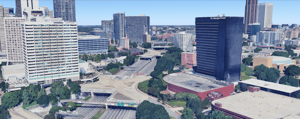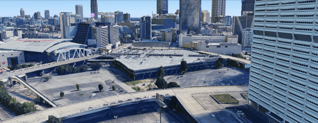 Downtown Atlanta’s story has been a bit different to Midtown’s in the past few decades. There certainly hasn’t been no development – the City of Atlanta and Georgia State University have been revitalizing where they can – but the difference is clear. Private development has, until recently, been much slower, the area is still riddled with parking lots, and (especially in South Downtown) abandoned, shuttered buildings aren’t an uncommon sight. There are obviously a variety of reasons for this, and it’s beginning to change with public and private projects such as Centennial Yards and Georgia State’s Blue Line, but it is undeniable that the damn interstate creates a literal barrier between the success of the North and the stagnation of the South.