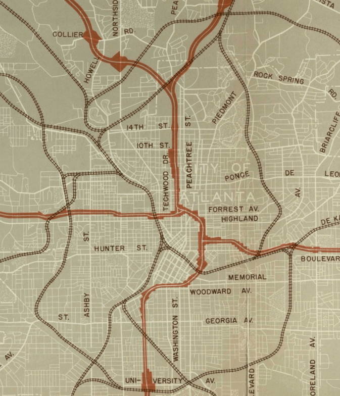 Much like lobotomies, there was a solution to this problem that cities all over the United States (and the world, to be fair) were applying: carving up their downtowns and adding highways, many of which would be interstates by the time they were completed, right through the city center. This is a horrendous method of city design in so many ways, not the least of which is slashing the city in half to make way for drivers, the majority of which pass through, not into, the city. Even though this would have a profoundly negative effect on the city of Atlanta for the rest of its history, the popular personal automobile and highway technologies were relatively new, and so it is maybe understandable that city planners would think this was the best way to develop their cities in the new post-war world.